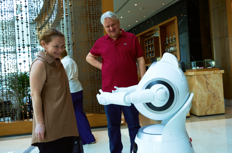 Подвижный и энергичный робопёс Робби. Играет с детьми в игры, исполняет танец, знает голосовые команды. Умеет лаять, а также разговаривает и понимает по-русски. На выставке он приводит к стенду огромное число гостей, которых далее могут обслуживать Мила и Борис