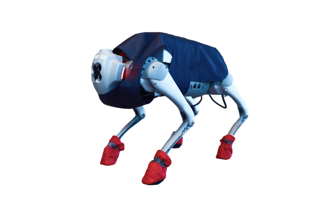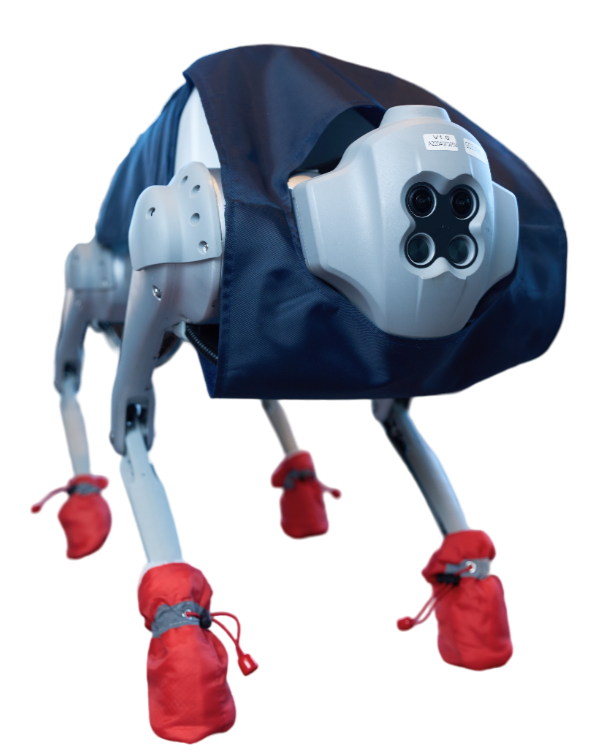 Робби хоть и собака, но часто работает в одежде: жилете и чехлах для лап. Всё это может быть выполнено в цветах компании, а жилет снабжён надписью или QR-кодом.